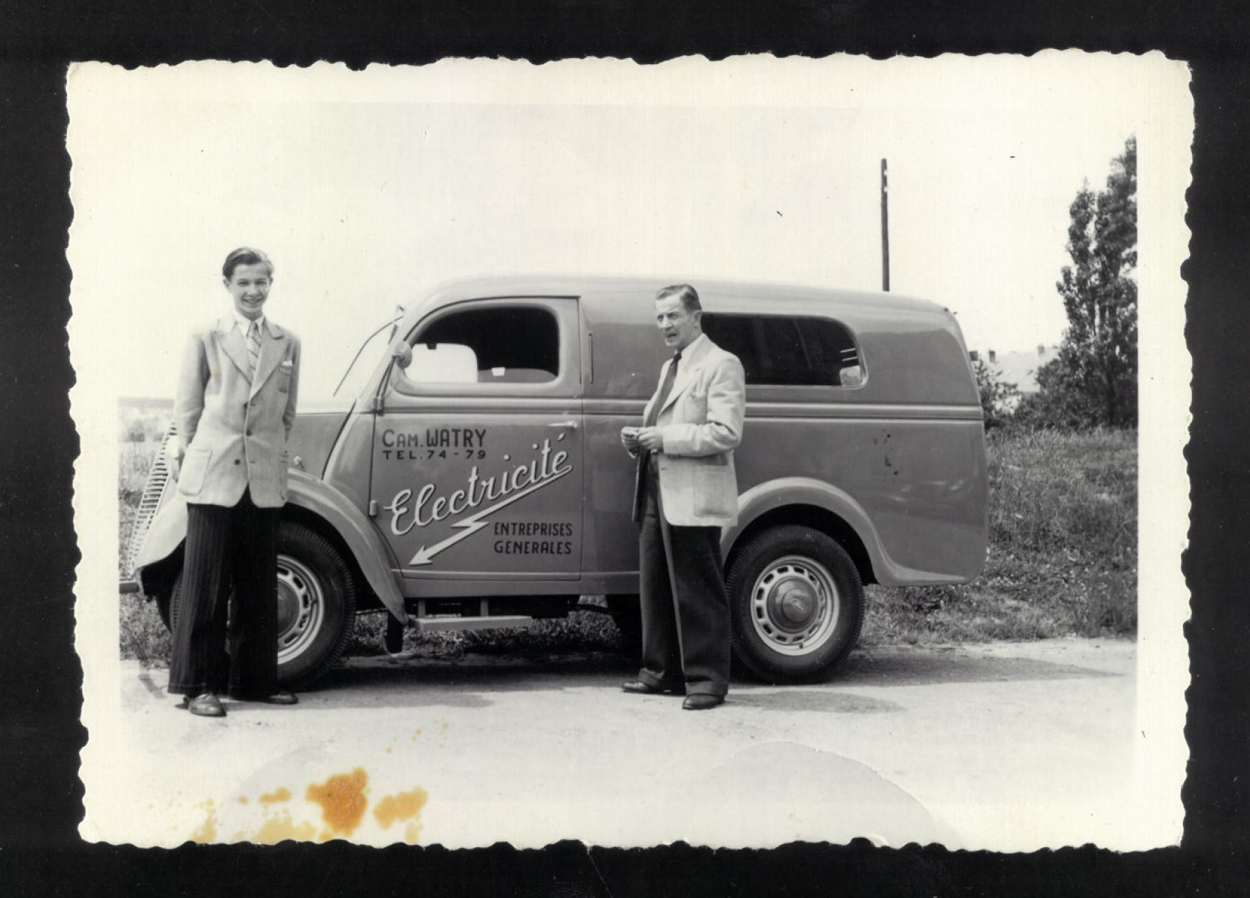 1945 – Camille Watry fonde son entreprise d’électricité générale sous le nom « Électricité Camille Watry », avec un seul apprenti à ses côtés. Les premiers travaux se concentrent sur le Théâtre des Capucins, où ils réalisent divers projets d’éclairage.
